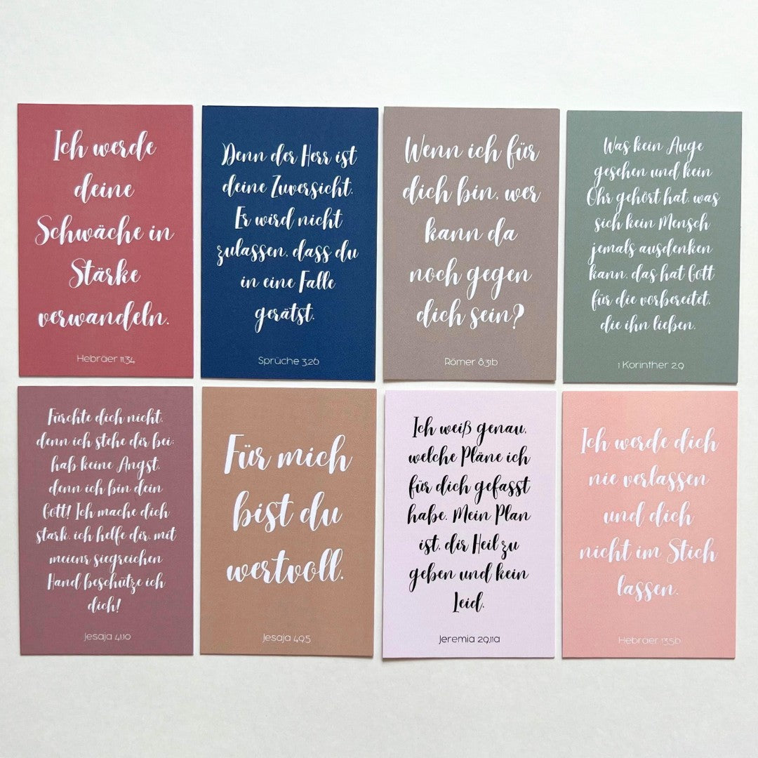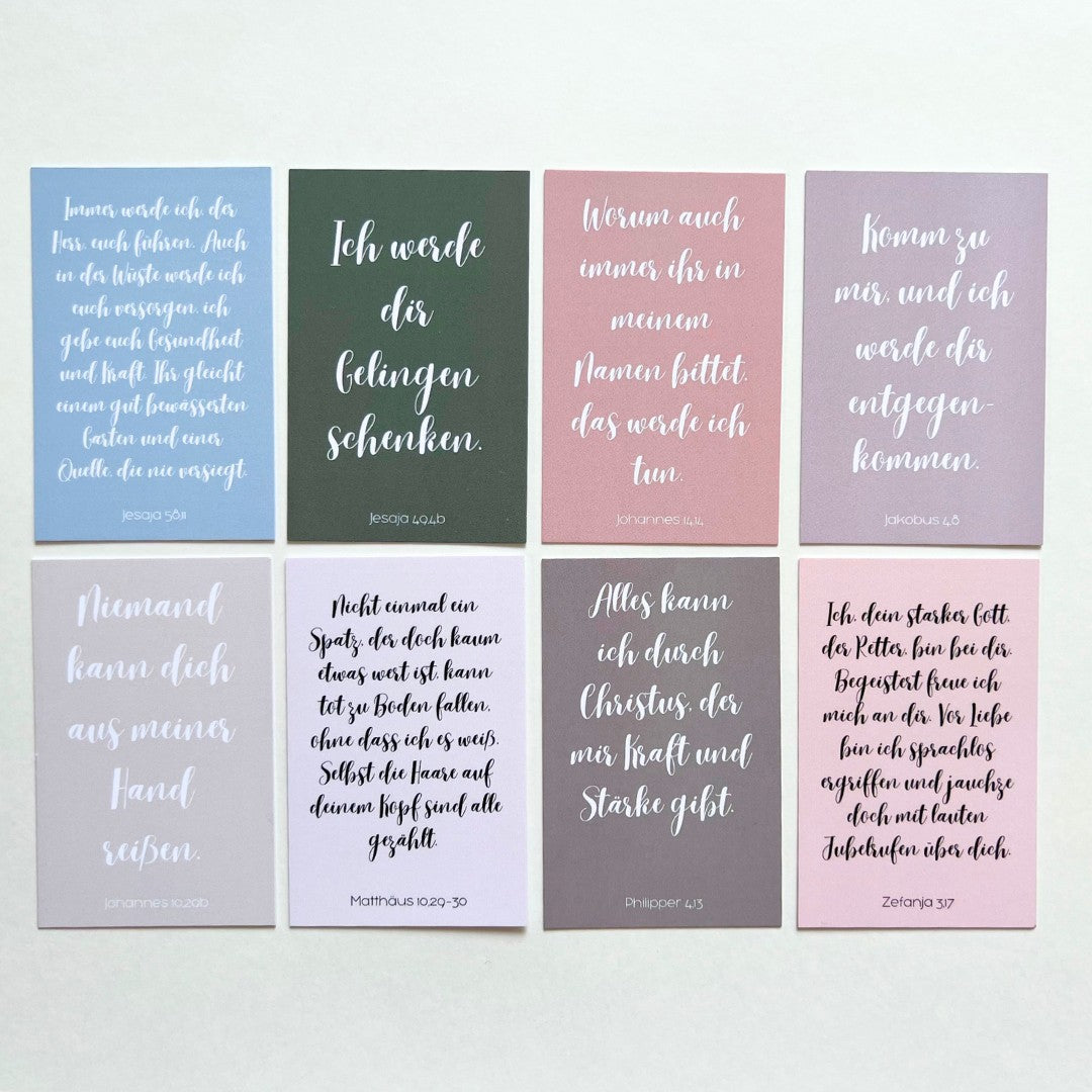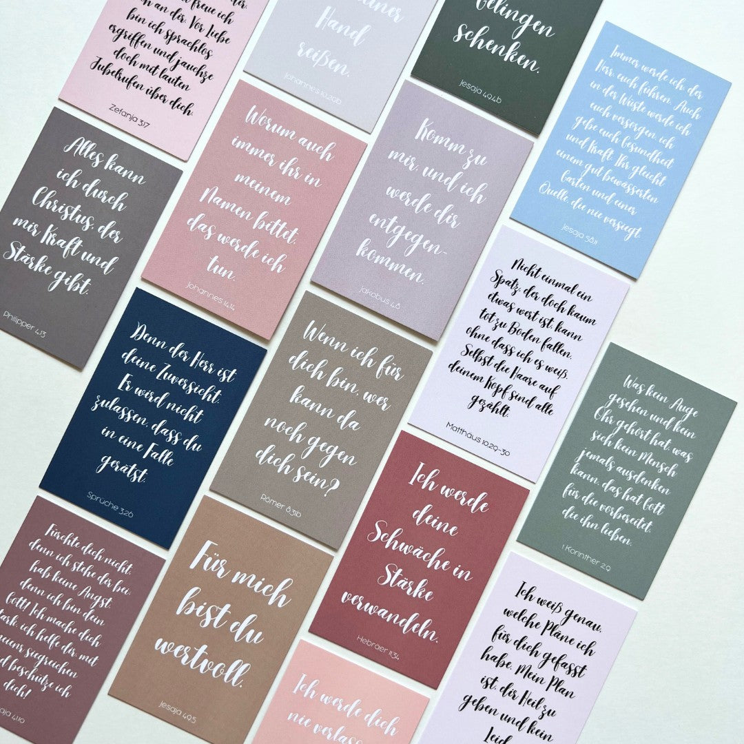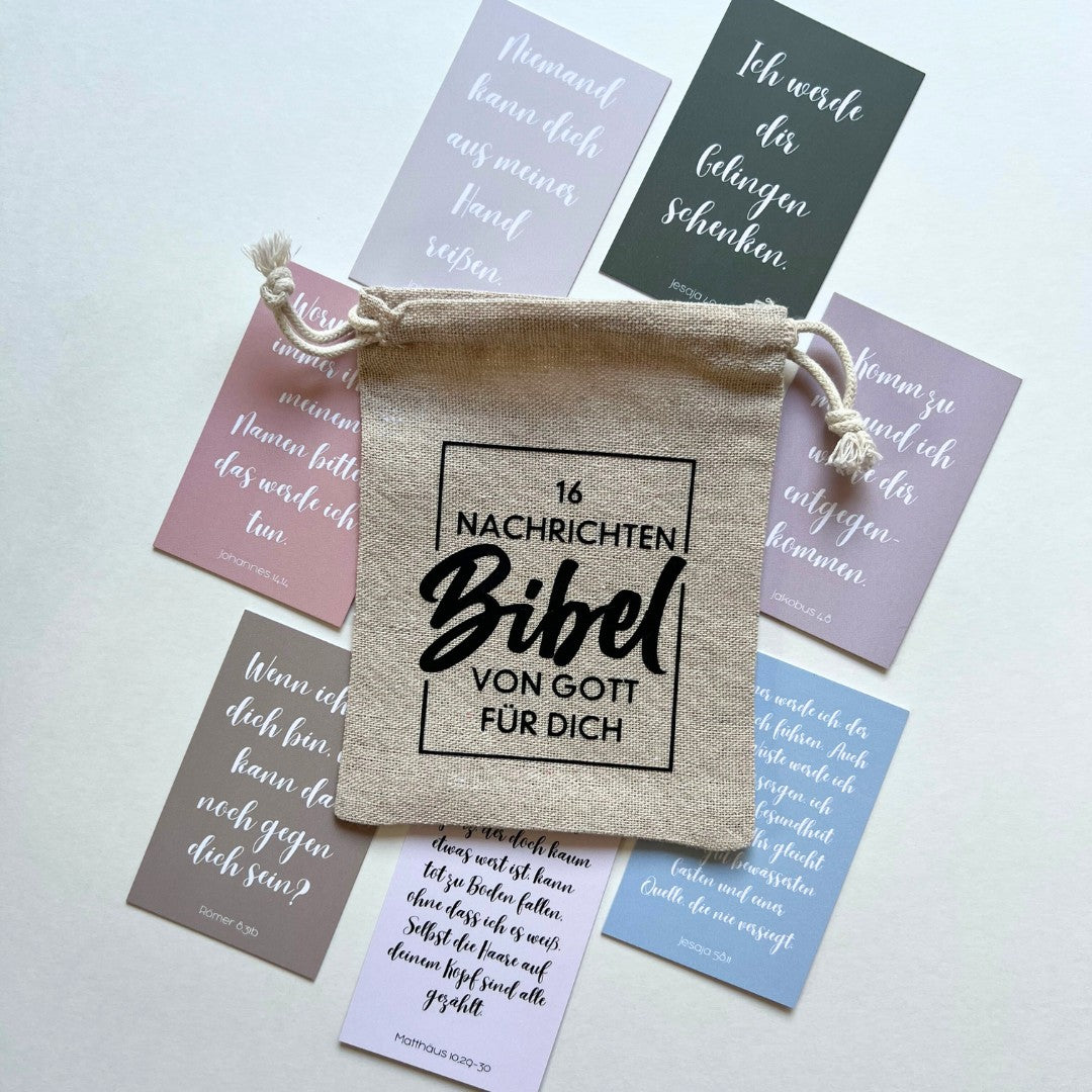 16 wundervolle Karten von Bibelversen aus der gesamten Bibel - Gottes persönliche Zusagen für dich und dein Leben. Eignet sich perfekt als Geschenk für Gläubige oder als Ermutigung in schwereren Zeiten. Schön verpackt in kleinem, naturbelassenem, selbst bedrucktem Jutesäckchen aus Baumwolle mit Kordelzug.