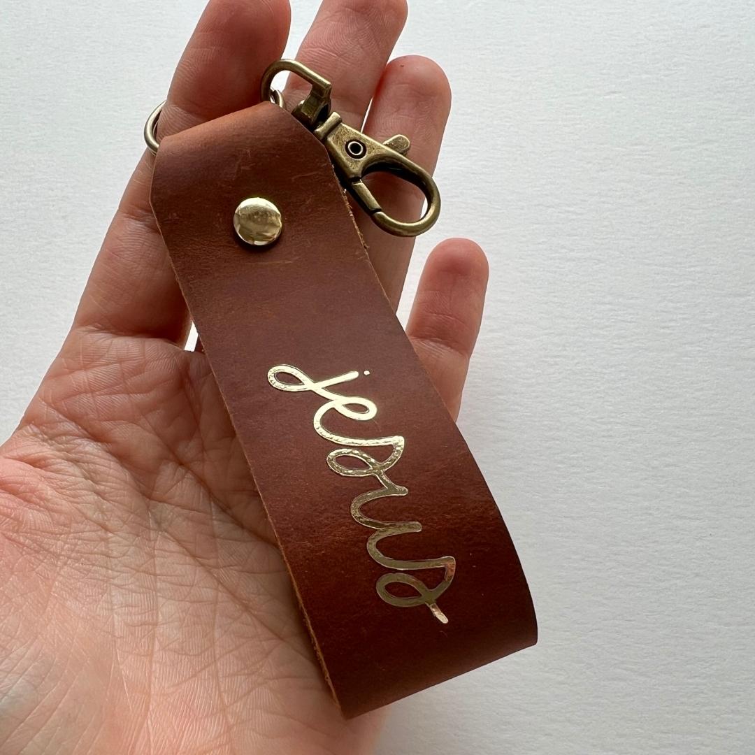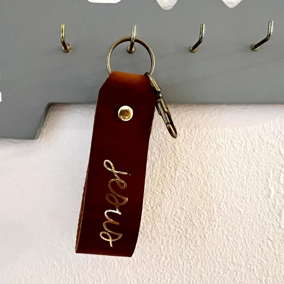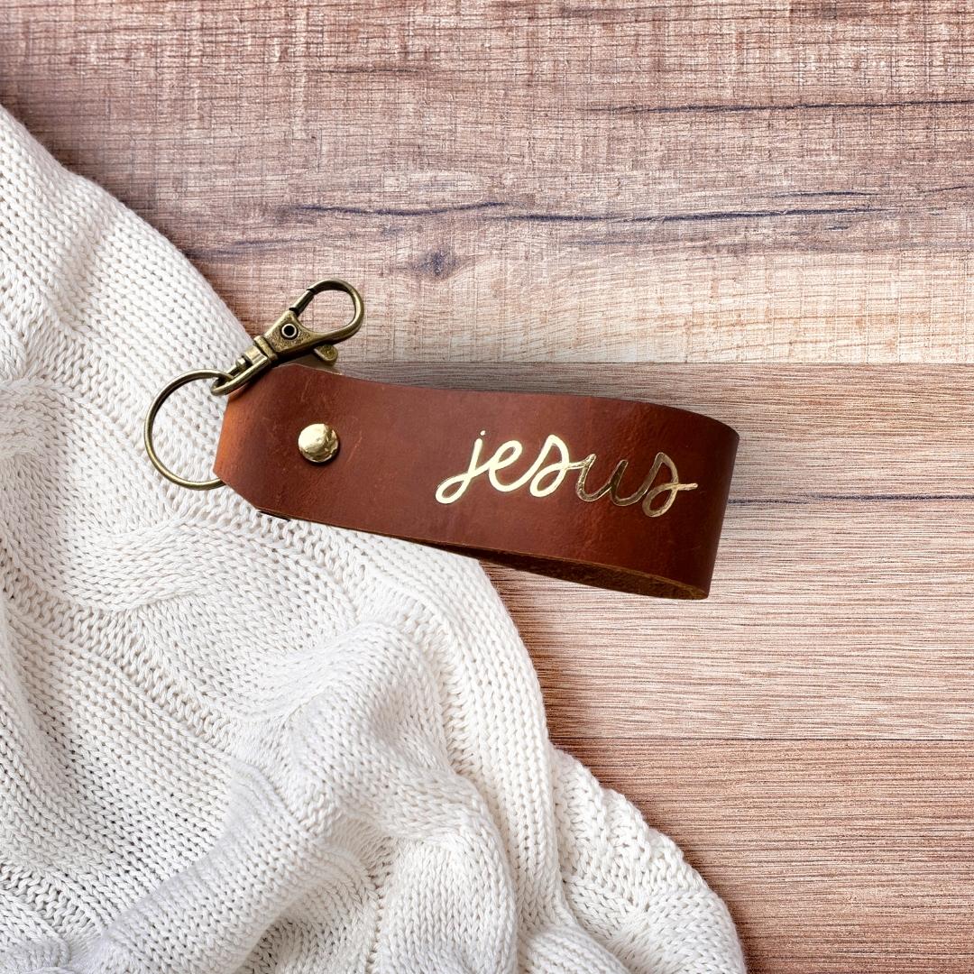 christlicher Schlüsselanhänger aus braunem Leder mit der Goldschrift "jesus"