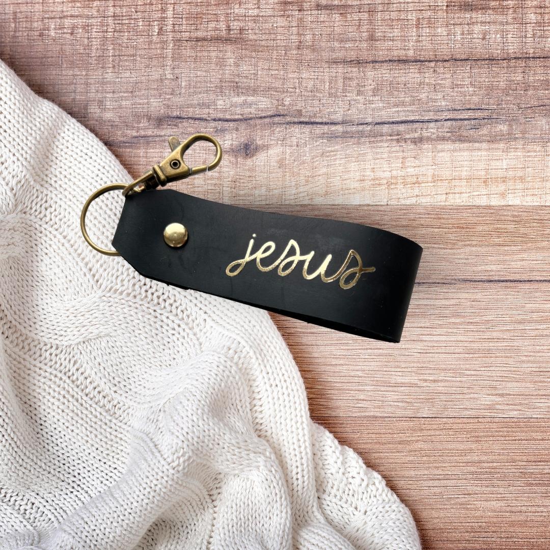 christlicher Schlüsselanhänger aus schwarzen Leder mit Goldschrift "jesus"