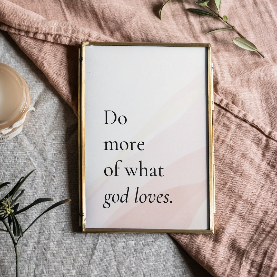Du erhältst ein schlichtes, aber tolles Design mit den Worten "Do more of what god loves."