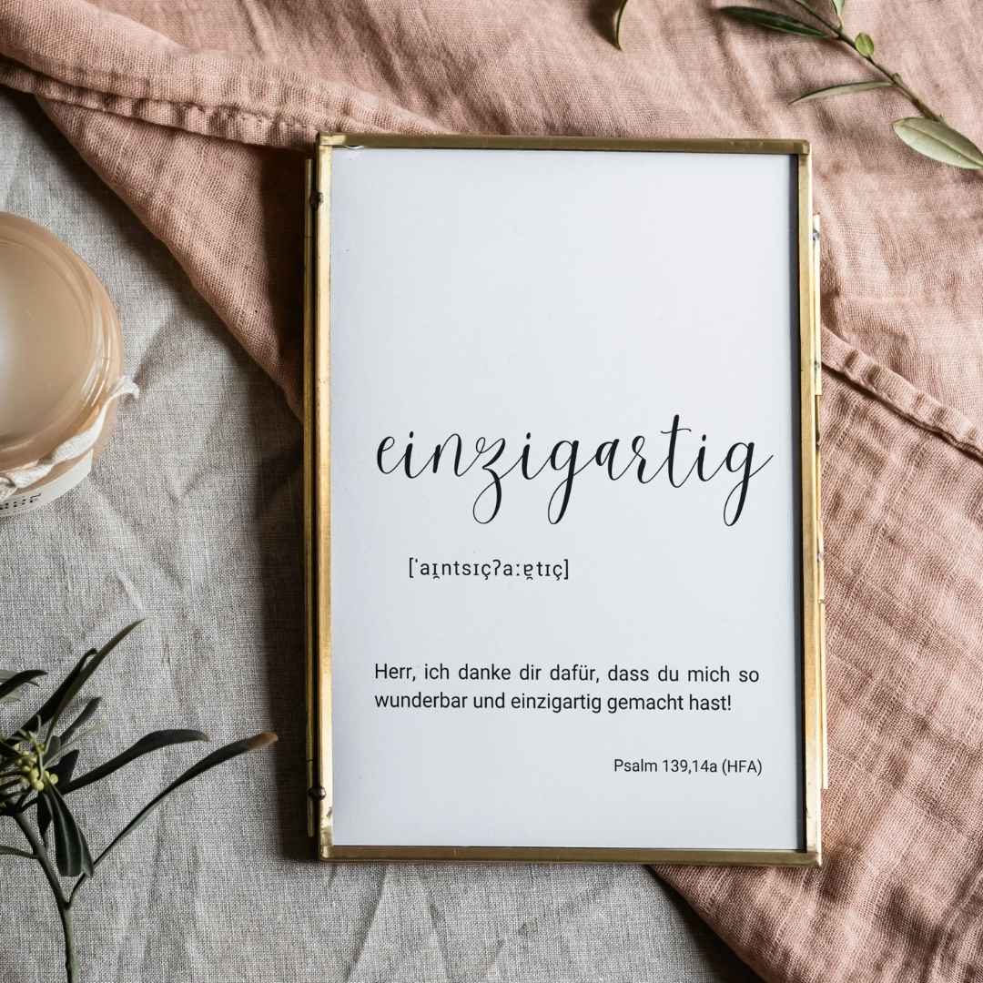 Du erhältst ein schlichtes, aber tolles Design zum Thema einzigartig sein, mit einem Bibelvers aus den Psalmen.