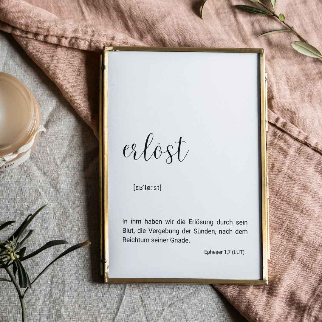 Du erhältst ein schlichtes, aber tolles Design zum Thema erlöst sein, mit einem Bibelvers aus Epheser.