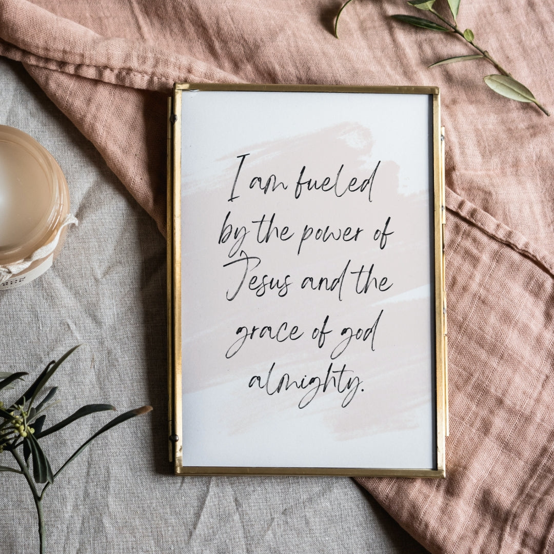 Du erhältst ein schlichtes, aber tolles Design mit den Worten "I am fueled by the power of Jesus and the grace of god almighty."
