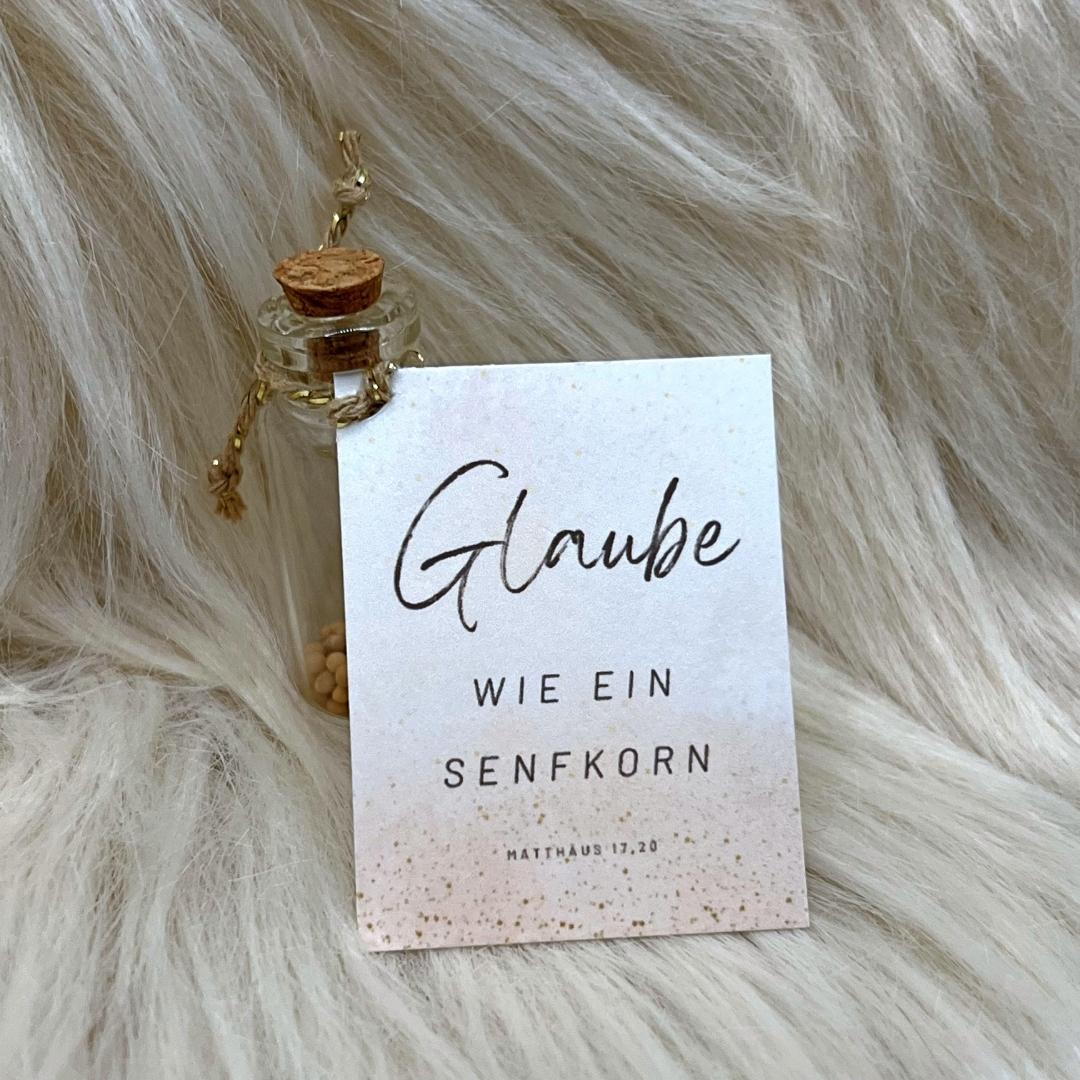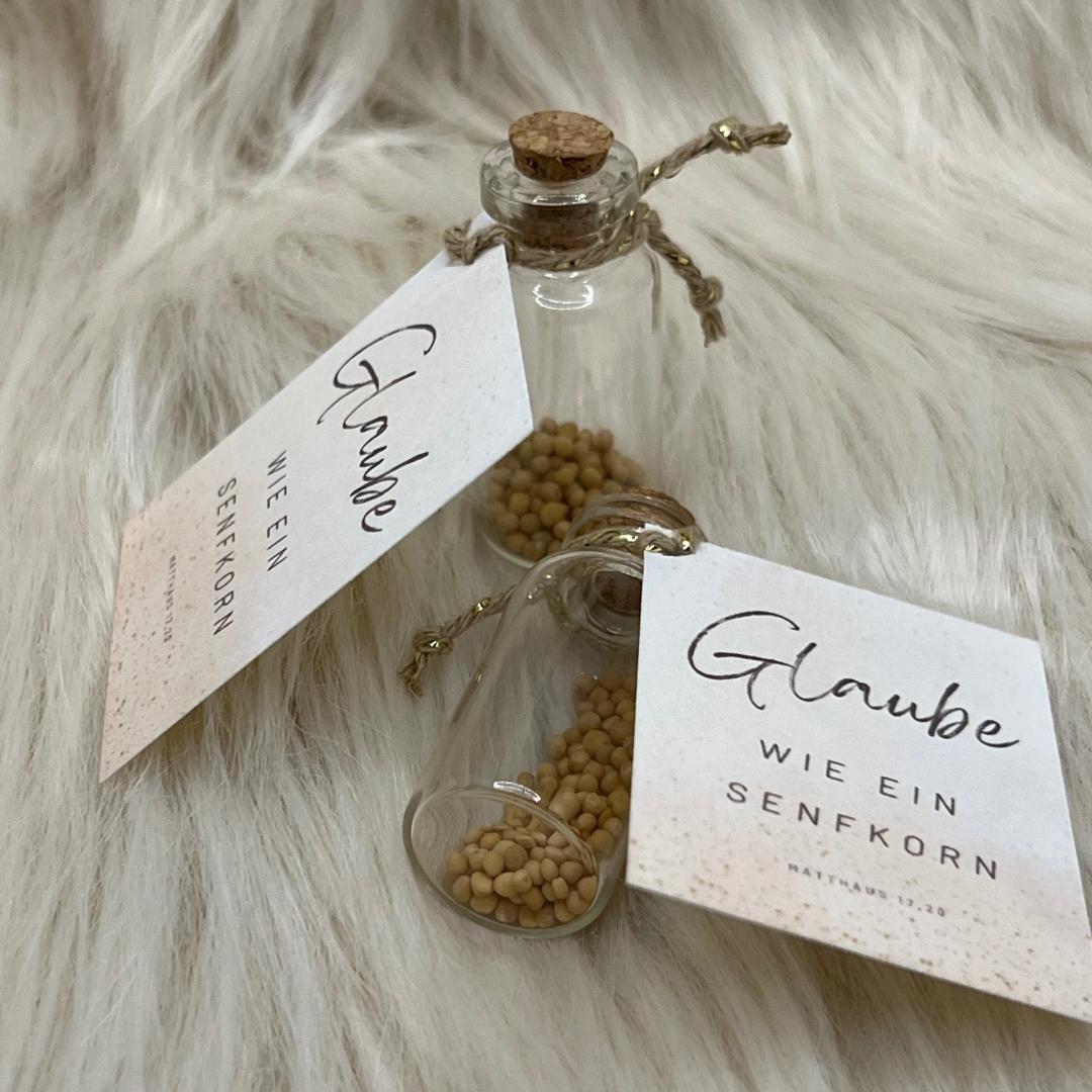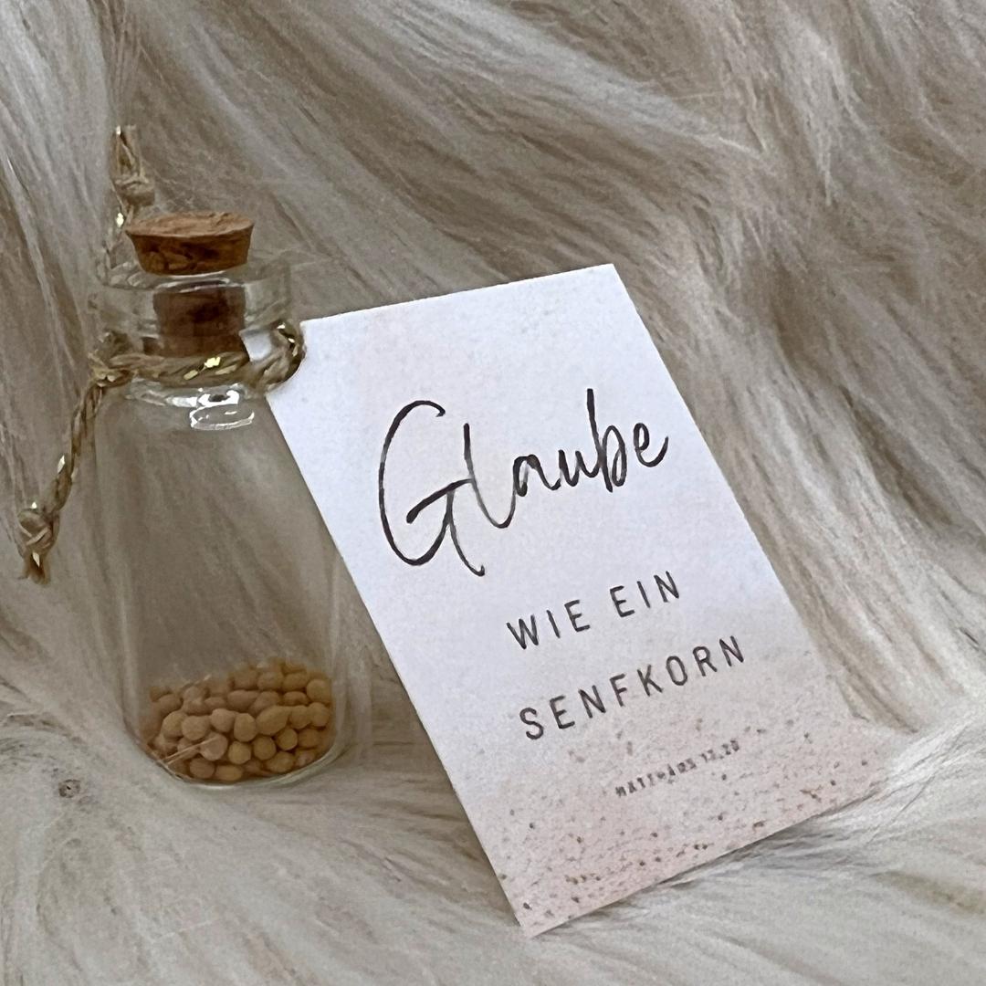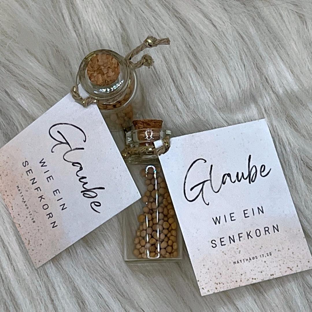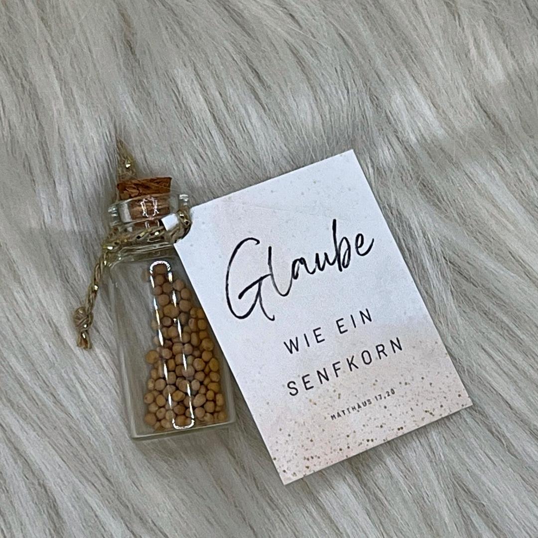 Was du hier bekommst ist ein liebevoll gestaltetes, kleines Fläschchen aus Glas mit einigen Senfkörnern gefüllt und einem Korken verschlossen. Angebracht ist die Nachricht "Glaube wie ein Senfkorn" als Referenz für die Bibelstelle in Matthäus 17,20 "Wenn euer Glaube nur so groß ist wie ein Senfkorn, könnt ihr zu diesem Berg sagen: >Rücke von hier nach dort!<, und es wird geschehen. Nichts wird euch dann unmöglich sein!"