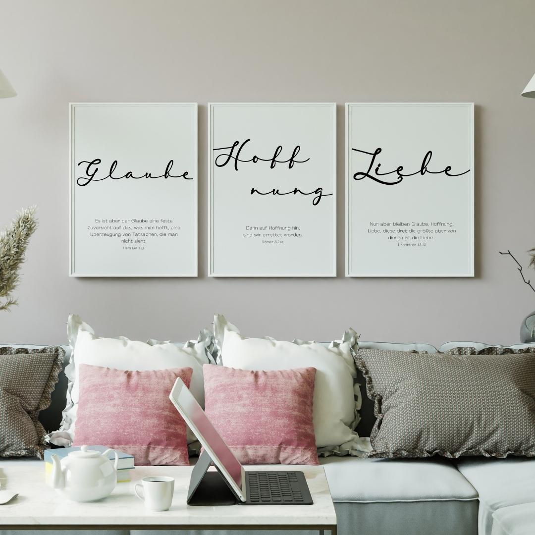 Du erhältst ein schlichtes, aber tolles Design bestehend aus drei Teilen mit den Worten Glaube, Hoffnung, Liebe und jeweils einem dazu passenden Bibelvers.