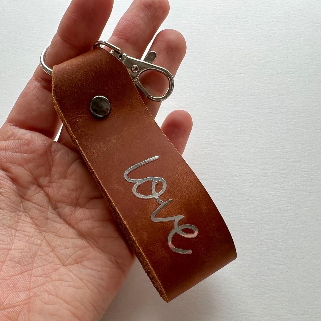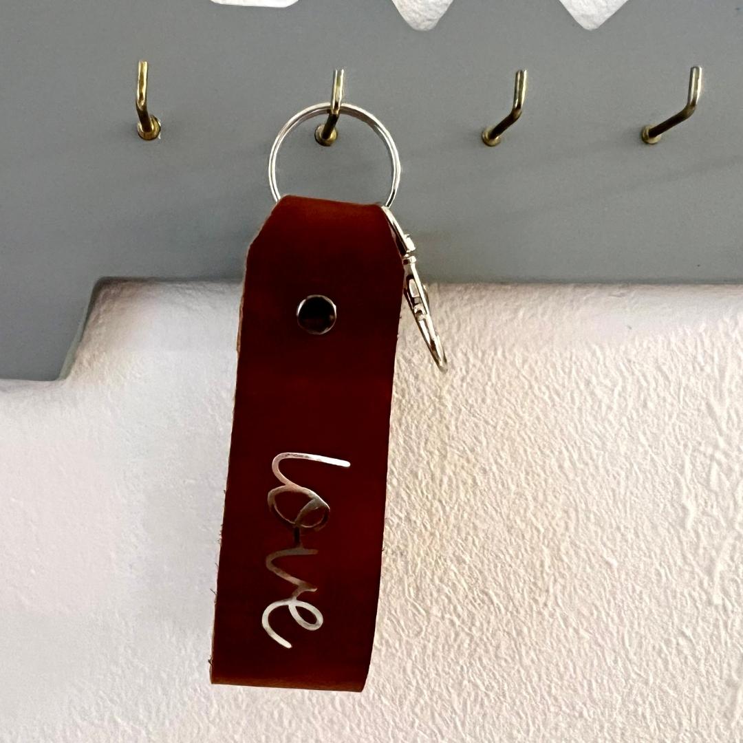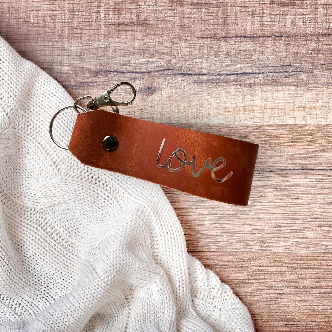 christlicher Schlüsselanhänger aus braunem Leder mit Silberschrift "love"
