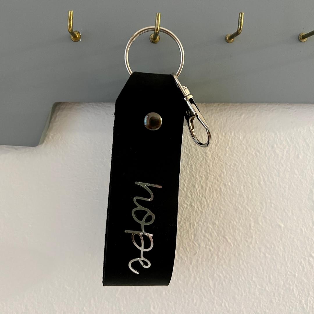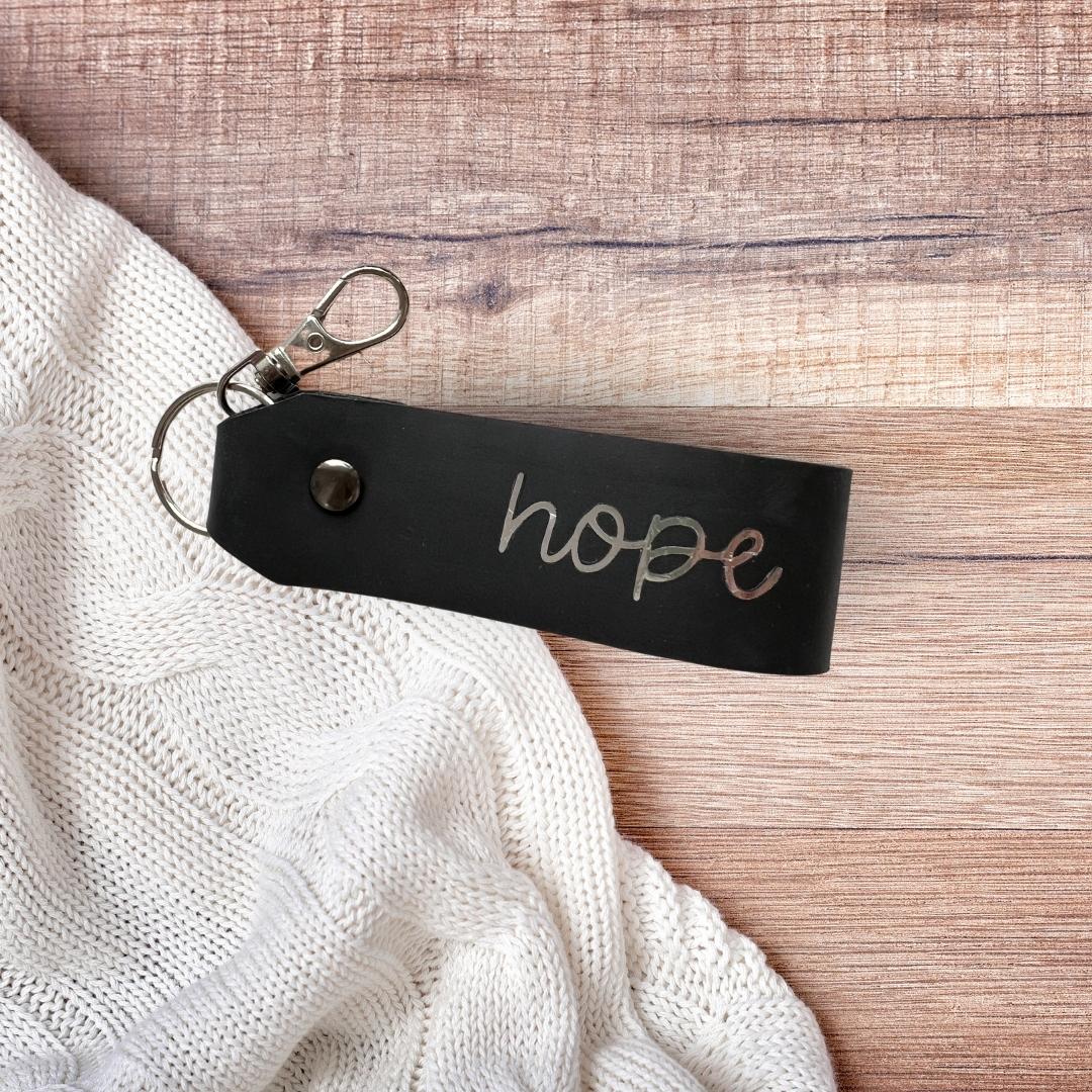 christlicher Schlüsselanhänger aus schwarzem Leder mit Silberschrift "hope"
